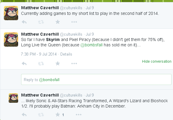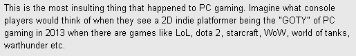 That is half the joy in playing games... finding something unexpected and new... and the more people who make games and the more voices there are in the industry across the board from developers, producers, writers and artists to reviewers, critics and academics, the easier it will be to find that strange, entertaining new thrill, and I don't want that to go away. It vexes me that 2014 is tainted because so many voices were silenced and pushed out of industry and I think about all the games I won't be able to play or hear about because of it.